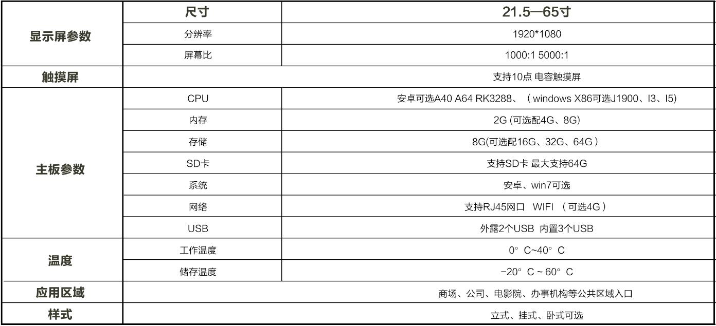超薄機身;質感拉絲金屬;高清畫質;觸摸極速反應;智能分屏;智能遠程信息發布;可定時開關機;提前設定節目源;鋼化玻璃屏幕;可定制專屬LOGO、多種顏色、尺寸可選。